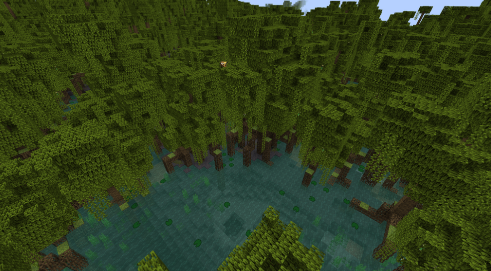 The Mangrove Swamp is a wetland biome. It is a new type of swamp filled with mangrove trees. These trees have unique root formations that make the terrain a bit more complex. The Mangrove Swamp is a source of new wood and is home to frogs, which were also added with this update.
