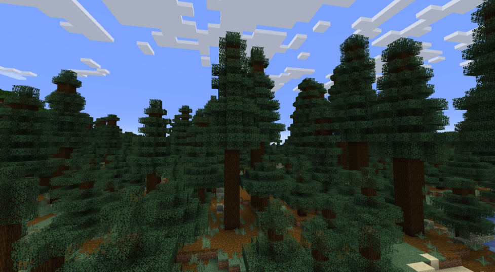 The Taiga biome is a forested biome. The taiga biome features densely filled spruce trees and colder climates with snow during winter. It is a great source of wood.