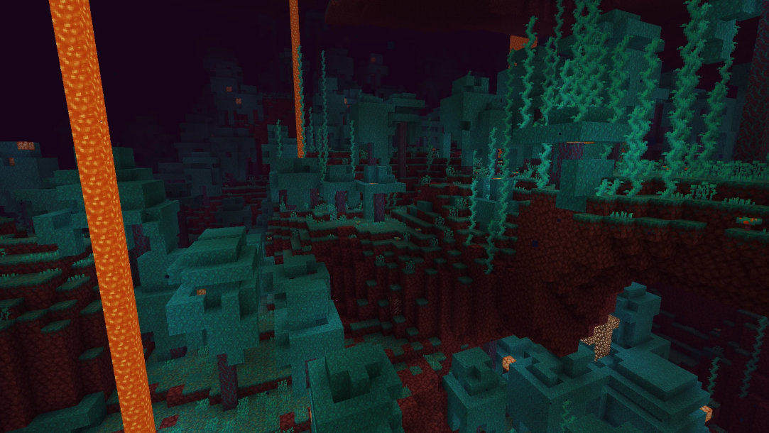The Warped Forest is a biome in the Nether. It is characterized by its blue-green blocks and fungi. It is a safe biome in the Nether as it does not have any hostile mobs spawning naturally. The warped forest is a great place to find new wood.