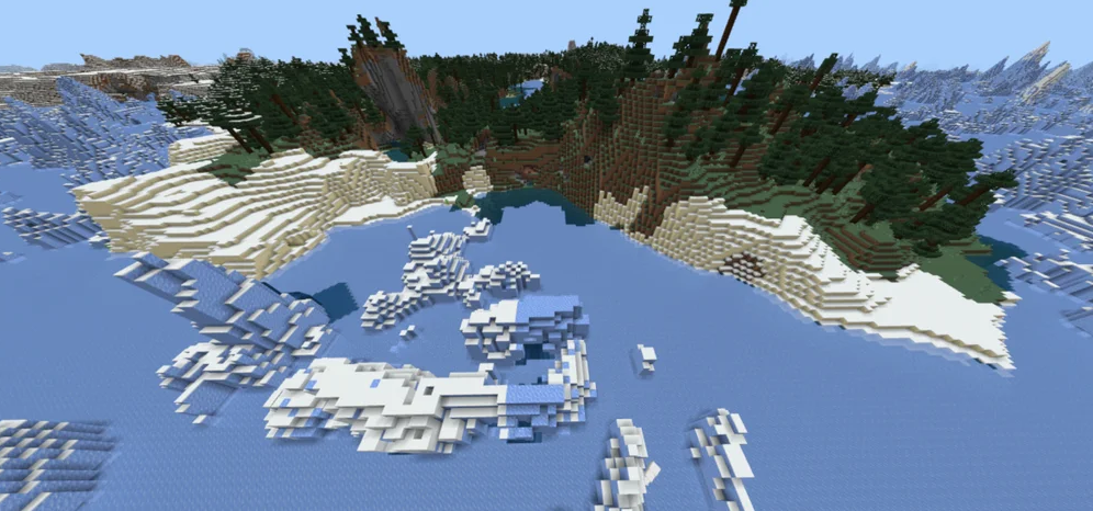 For players who enjoy exploring cold environments, this best seeds entry is for you. You will spawn point overlooking a chilly Taiga forest biome that borders a Frozen Ocean biome. Digging on the snowy beach will yield buried treasure and copper veins, providing excellent initial resources.