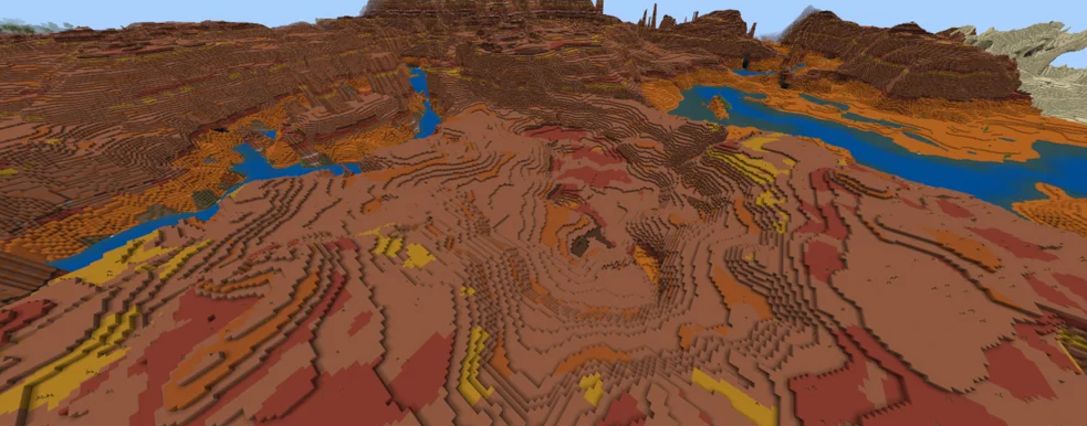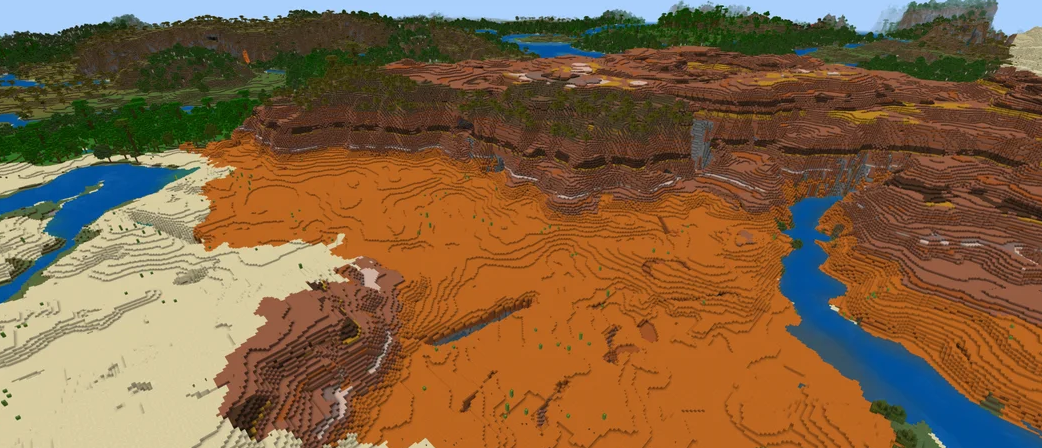 This Minecraft seed puts you right in the middle of a vast stretch of Badlands, which is a great challenge for experienced players. You can climb the nearby Wooded Badlands for wood. The spawn location provides a striking landscape of orange and red blocks.