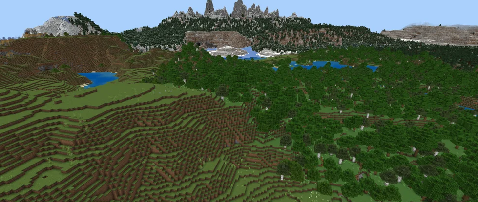 This amazing seed places your spawn point in a Taiga forest biome that meets several other biomes, including a Swamp and Snowy Plains. This diversity provides great initial valuable resources right away. A Zombie Taiga Village is not far from your spawn location, and there is an air of mystery around the entire area due to the idyllic snowy mountains nearby.