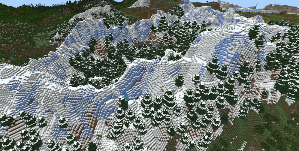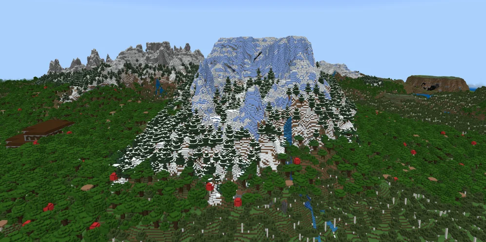 You will spawn near a colossal mountain of ice spikes and snow that dominates the landscape. Even better, a woodland mansion is hidden in the dark forest biome right next to the mountain. This structure is excellent for a massive initial home or for gathering rare totems.